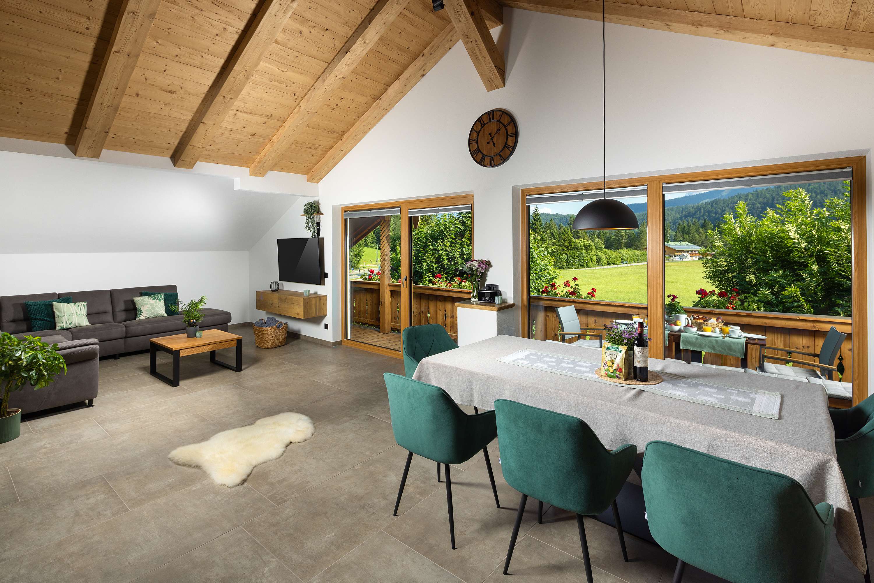 Das Herzstück der Wohnung ist der 13 Meter lange Balkon mit atemberaubendem Panoramablick auf den Watzmann. Hier beginnen die Tage mit einem stillen Moment bei Kaffee und Bergblick – und enden bei Sonnenuntergang mit einem Glas Wein, während die Gipfel in warmes Licht getaucht werden.